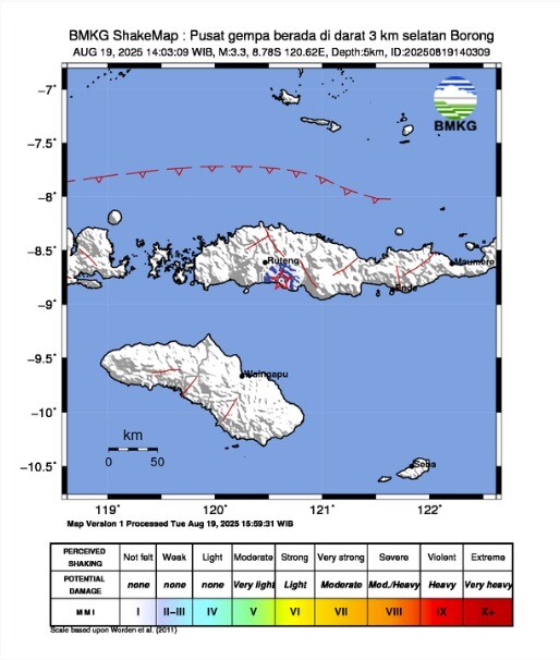 Kepala Stasiun Geofisika Kupang, Arief Tyastama, S.Si, M.Si, dalam keterangannya kepada media ini melalui WhatsApp menjelaskan, “Pada Selasa, 19 Agustus 2025 pukul 14:03:09 WIB, wilayah Borong diguncang gempabumi tektonik. Hasil analisa BMKG menunjukkan gempabumi ini berkekuatan M=3,3. Episenter terletak pada koordinat 8,78° LS; 120,62° BT, atau tepatnya di darat pada jarak 3 km selatan Borong dengan kedalaman 5 km.”